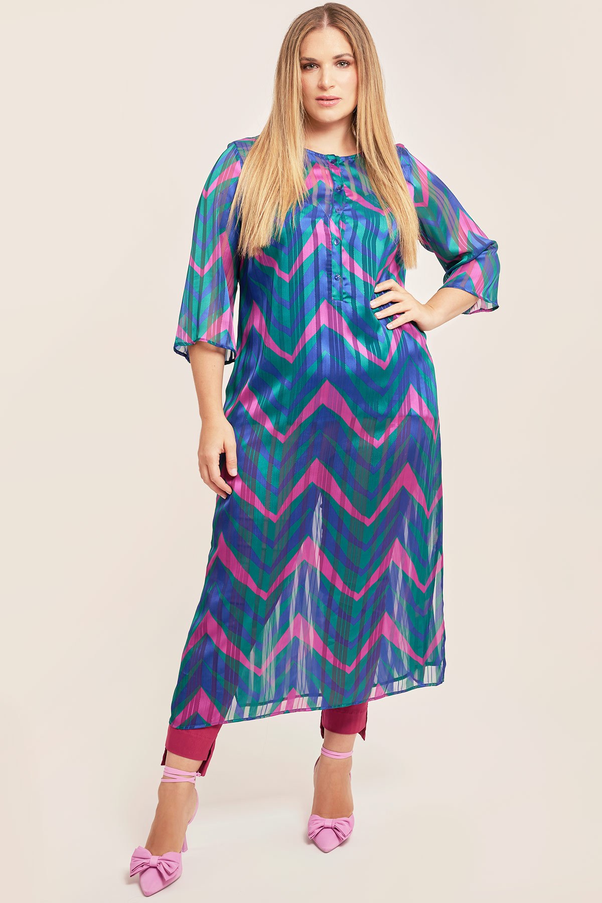 Maxi φόρεμα από ανάλαφρη ύφανση chiffon, ημιδιαφανές. Εμπριμέ σε γεωμετρικό μοτίβο. Μανίκια 3/4 και στρογγυλή λαιμόκοψη. Πατιλέτα με κουμπιά κατά μήκος έως τη μέση. Άνοιγμα στο πλάι. Μπορεί να φορεθεί και σαν καφτάνι. Το μοντέλο έχει ύψος 179 εκ, στήθος 109, μέση 89, περιφέρεια 119 και φοράει το μέγεθος Μ