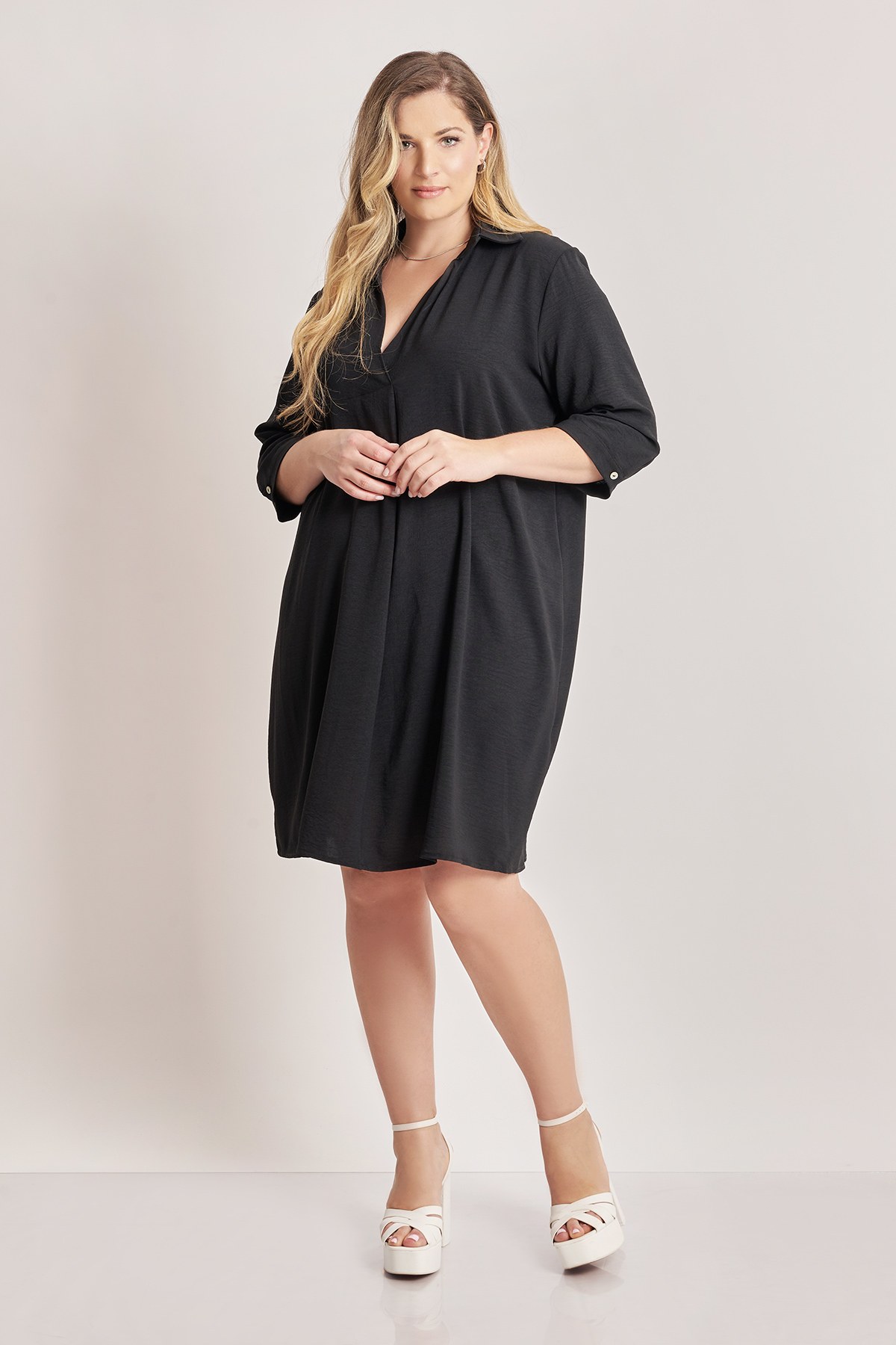 Μίντι φόρεμα σε washed ύφανση με δροσερή κι ανάγλυφη υφή. V λαιμόκοψη με γιακά. Μανίκια 3/4 με μανσέτα με κουμπί. Πιέτα μπροστά. Στυλ πουκαμίσας. Το μοντέλο έχει ύψος 179 εκ, στήθος 109, μέση 89, περιφέρεια 119 και φοράει το μέγεθος S