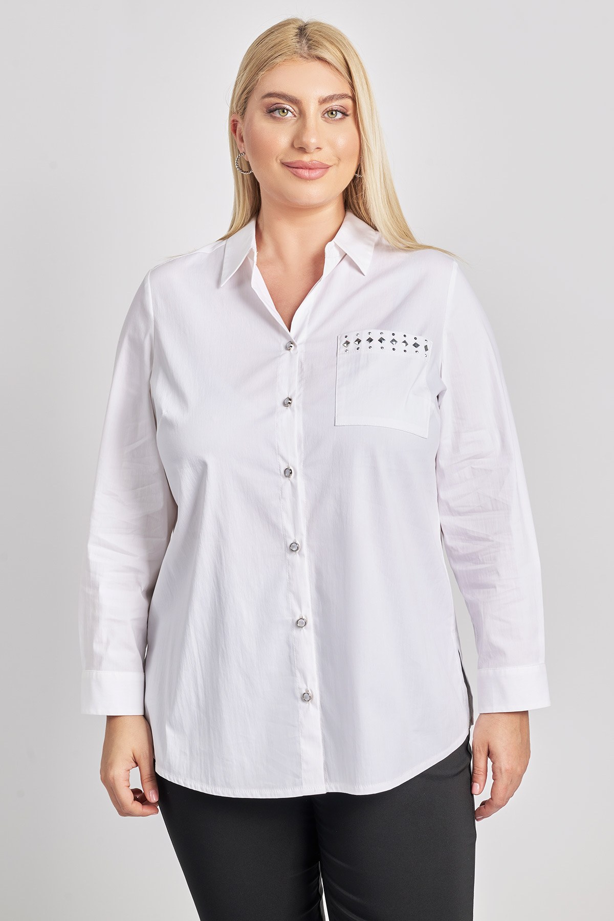 Πουκάμισο βαμβακερό με μακριά μανίκια. Γιακάς πουκαμίσου και κλείσιμο μπροστά με κουμπιά. Τσέπη μπροστά με διακόσμηση. Το μοντέλο έχει ύψος 177εκ, στήθος 110, μέση 85, περιφέρεια 115 και φοράει μέγεθος S