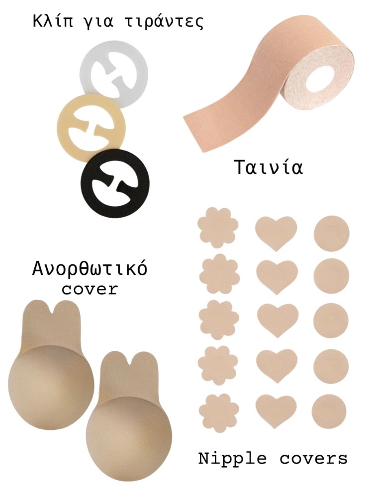 Το κιτ περιέχει 3 κλιπ για να κάνετε χιαστι τις τιράντες του σουτιέν σας 1 αυτοκόλλητη ταινία 5 σετ αυτοκόλλητα καλύμματα θηλων 1 Ανορθωτικό αυτοκόλλητο σουτιέν