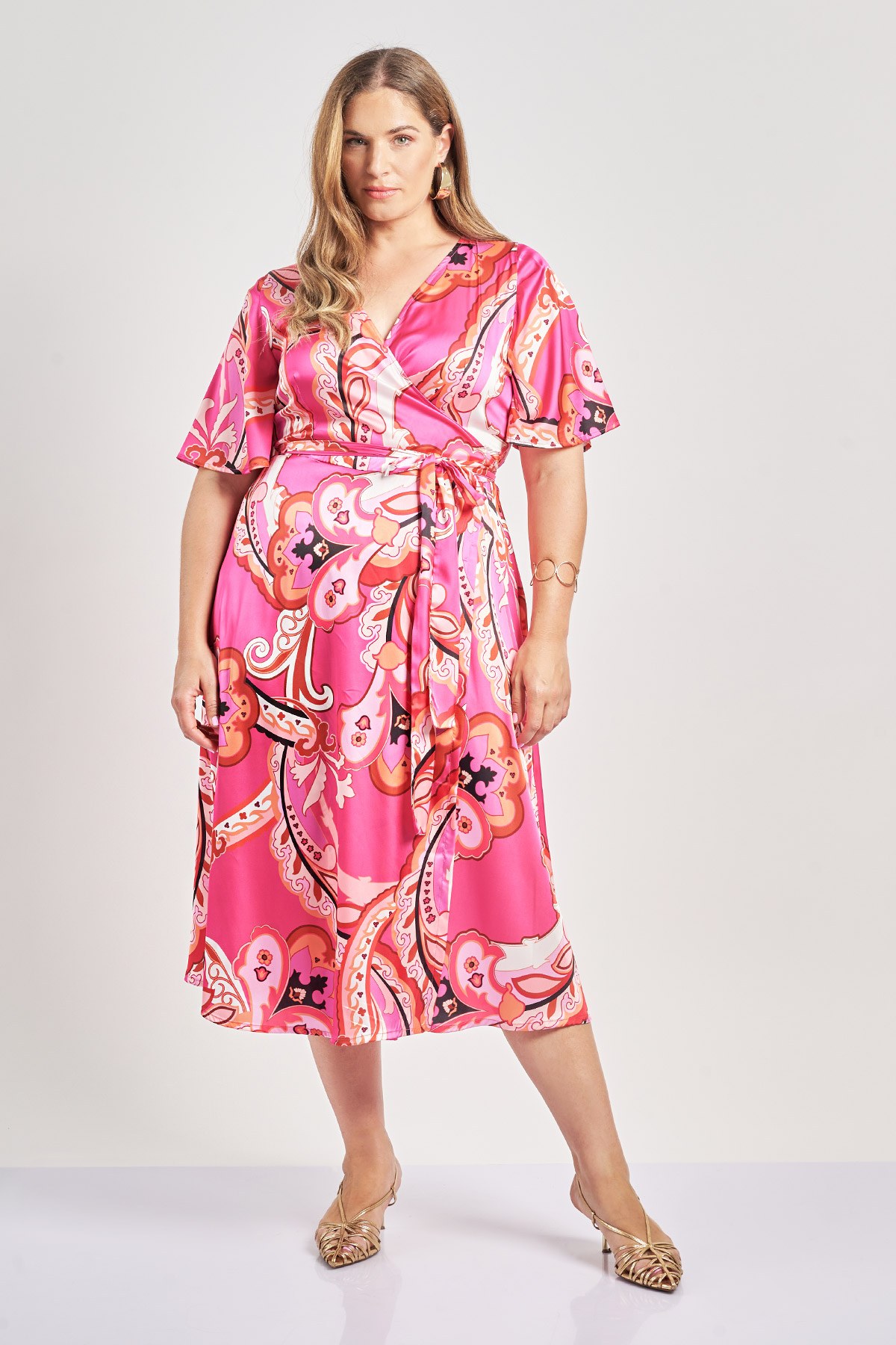Βραδινό φόρεμα μίντι σε ελαστική εμπριμέ λαχούρια ύφανση με σατινέ όψη και υφή. V λαιμόκοψη. Κοντά μανίκια. Κρουαζέ σχέδιο με ενσωματωμένη ζώνη που δένει και φούστα σε κλος γραμμή. Το μοντέλο έχει ύψος 180 εκ, στήθος 107, μέση 95, περιφέρεια 122 και φοράει το μέγεθος S