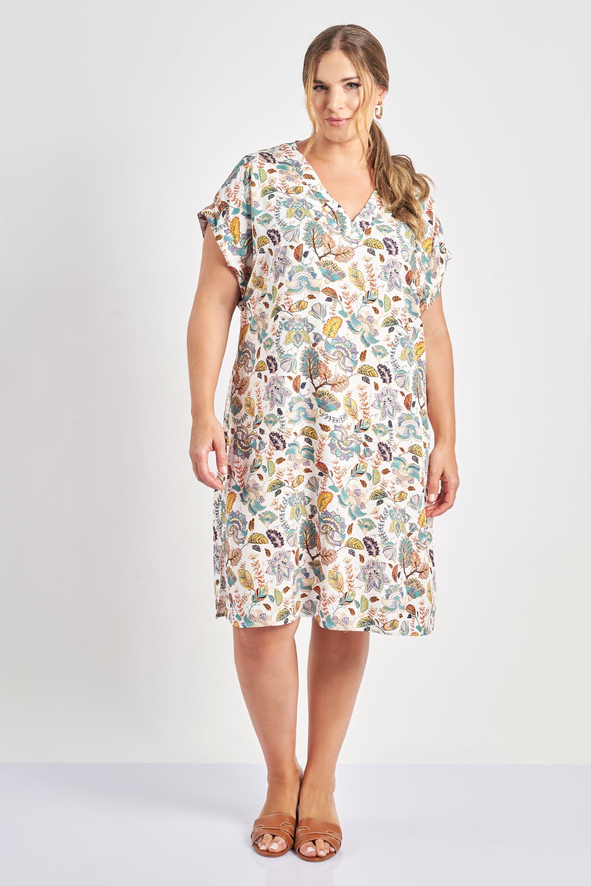 Φόρεμα μίντι από εμπριμέ βισκόζη. Σε ίσια γραμμή, με V λαιμόκοψη και ζαπονέ κοντά μανίκια με ρεβέρ. Άνετη εφαρμογή. Πλαϊνά ανοίγματα στον ποδόγυρο. Διατίθεται σε διαφορετικά εμπριμέ φλοράλ μοτίβα. Το μοντέλο έχει ύψος 180 εκ, στήθος 107, μέση 95, περιφέρεια 122 και φοράει το μέγεθος S