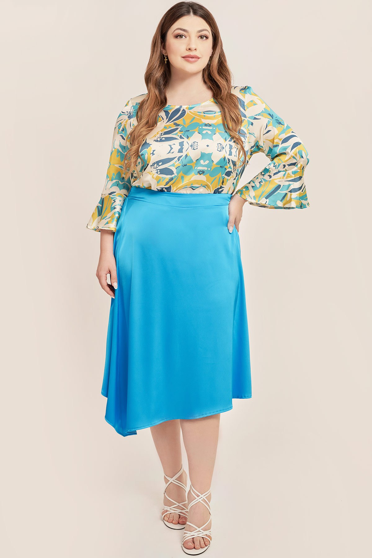 Σατέν φούστα ασύμμετρη. Ελαστική μέση για άψογη εφαρμογή. Σε άνετη γραμμή. Από ανακυκλωμένο ύφασμα. Το μοντέλο έχει ύψος 172εκ, στήθος 112, μέση 97, περιφέρεια 117 και φοράει το μέγεθος M