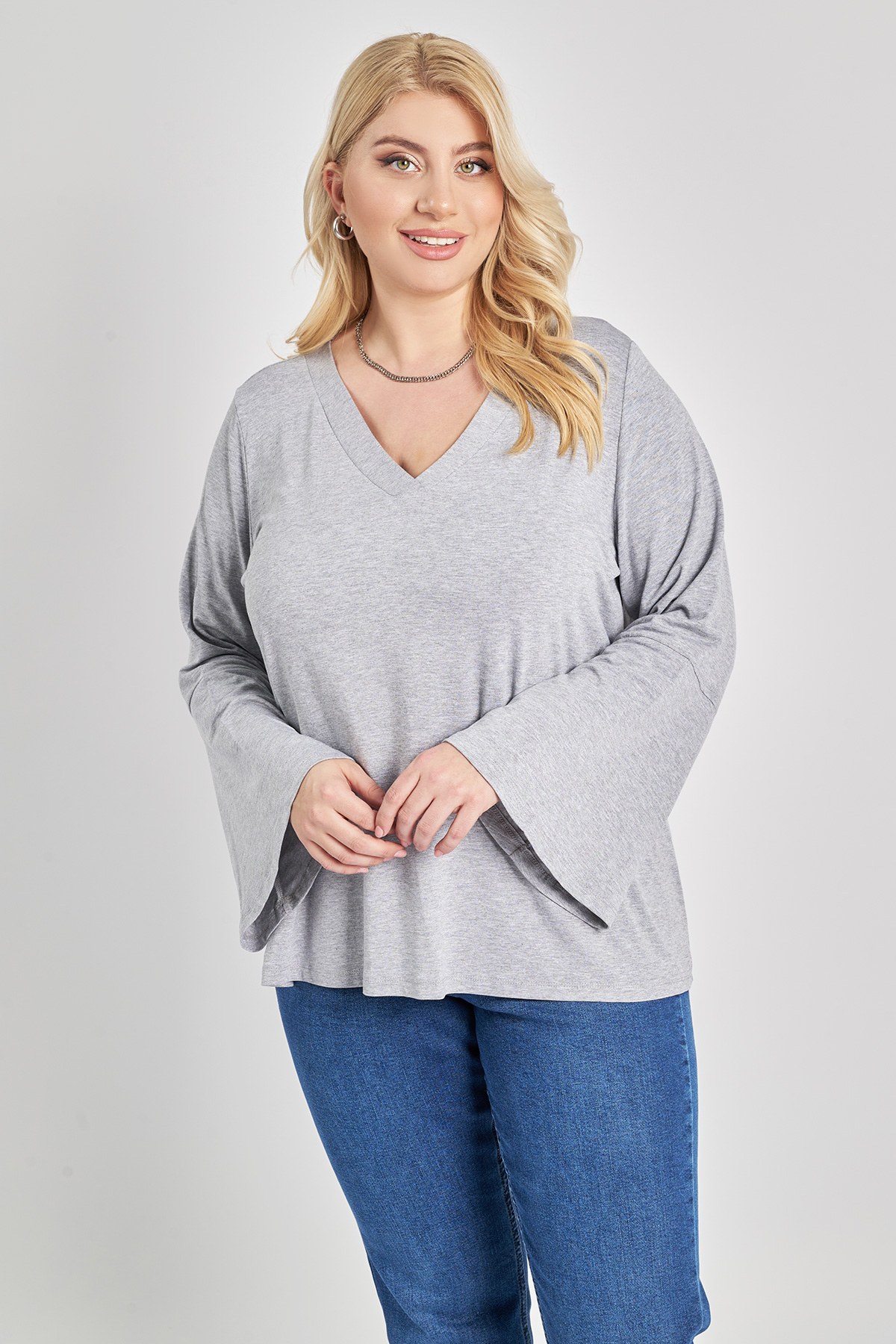 Μπλούζα της σειράς Basic από ελαστική βισκόζη. Μακριά μανίκια με καμπάνα τελείωμα. Λαιμόκοψη V. Σε ίσια γραμμή. Μήκος μέχρι τους γοφούς.