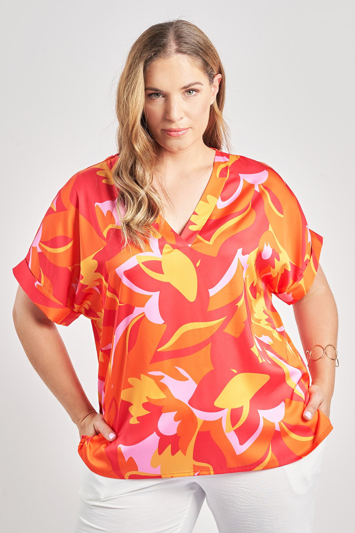 Μπλούζα σε σατινέ υφή με statement φλοράλ εμπριμέ. Με κοντά ζαπονέ μανίκια και ρεβέρ. V λαιμόκοψη και μικρά πλαϊνά ανοίγματα στο τελείωμα. Άνετη γραμμή. Το μοντέλο έχει ύψος 180 εκ, στήθος 107, μέση 95, περιφέρεια 122 και φοράει το μέγεθος S