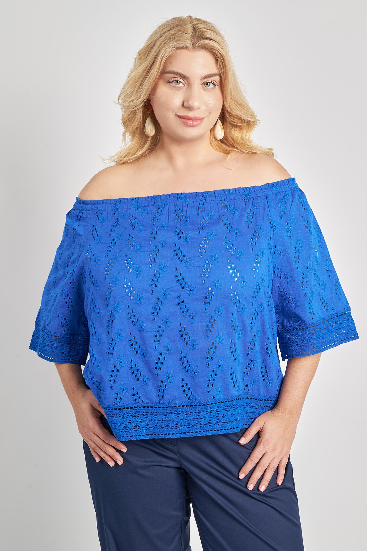 Έξωμη μπλούζα, από βαμβακερό μπροντερί ύφασμα. Εσωτερικό λάστιχο στο πάνω μέρος. Μανίκια 3/4. Διακοσμητική τρέσα δαντέλα στα τελειώματα. Το μοντέλο έχει ύψος 177εκ, στήθος 110, μέση 85, περιφέρεια 115 και φοράει μέγεθος S