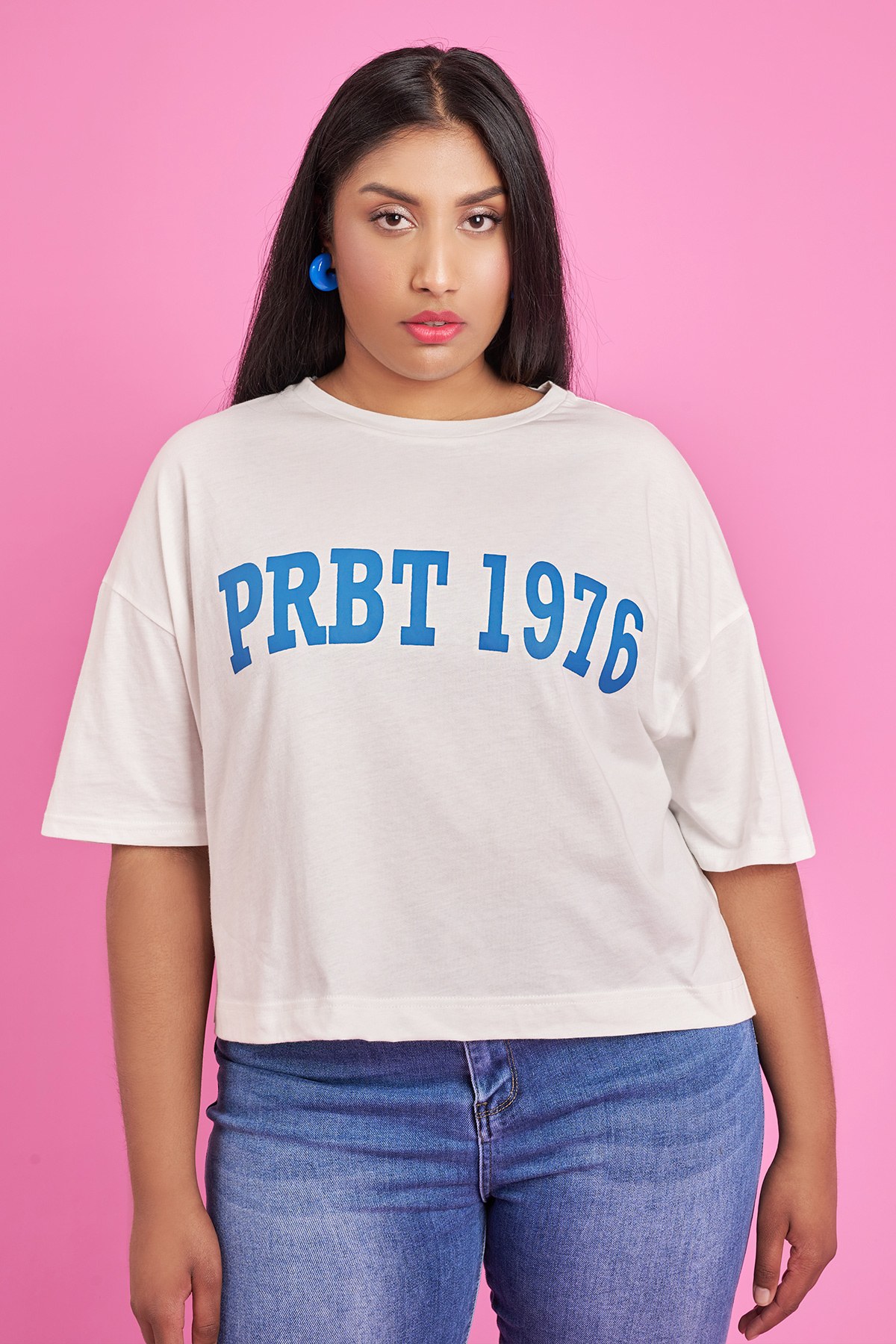 Βαμβακερή μπλούζα cropped. Στρογγυλή λαιμόκοψη και κοντά μανίκια. λογότυπο PRBT 1976. Το μοντέλο έχει ύψος 177 εκ, στήθος 95, μέση 81, περιφέρεια 116 και φοράει το μέγεθος Μ
