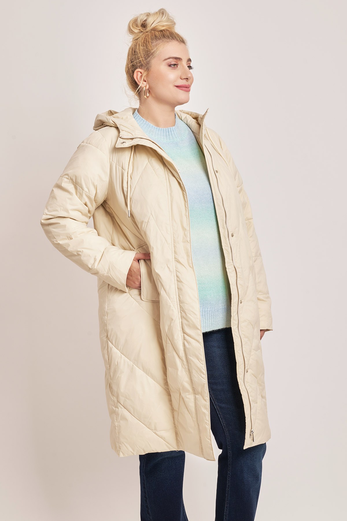 Μακρύ μπουφάν καπιτονέ αδαβροχοποιημένο, με ανθεκτικότητα στο νερό. Ενσωματωμένη κουκούλα με ρυθμιζόμενο κορδόνι. Μπροστινό κούμπωμα με κουμπιά σούστες και φερμουάρ. Μακριά μανίκια. Με φόδρα. Σε ίσια γραμμή. Πλαϊνές τσέπες. Το μοντέλο έχει ύψος 177εκ, στ