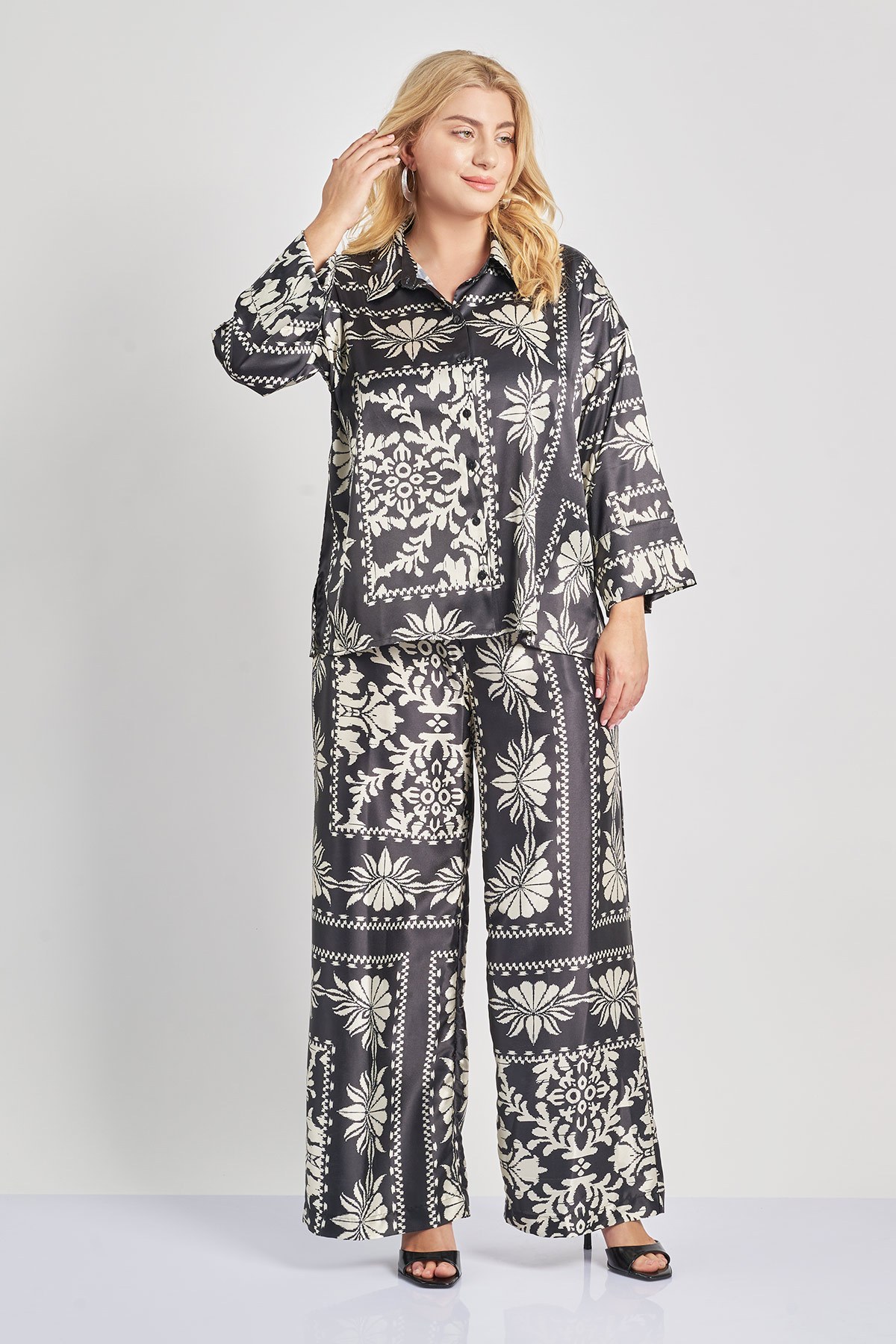 Παντελόνα από δροσερό σατέν ύφασμα και εμπριμέ γραφικό σε διάταξη μαντήλι. Ελαστική μέση και πλαϊνές εσωτερικές τσέπες. Άνετη γραμμή. Συμπληρώστε το σετ με το εμπριμέ πουκάμισο 012510507636. Το μοντέλο έχει ύψος 177εκ, στήθος 110, μέση 85, περιφέρεια 115 και φοράει μέγεθος S