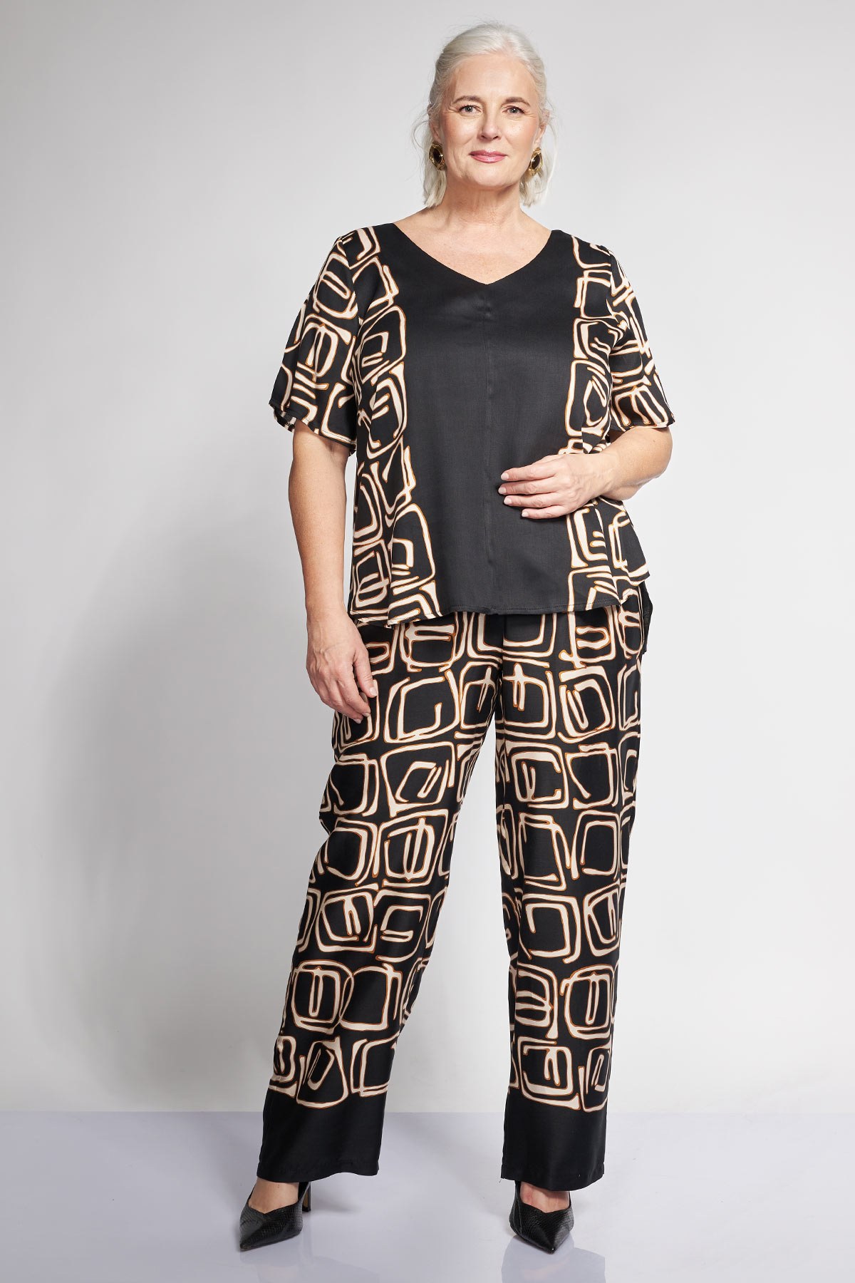 Ανακαλύψτε τον απόλυτο συνδυασμό άνεσης και στυλ με μια παντελόνα που ξεχωρίζει για το δυναμικό της μοτίβο και την αέρινη κίνησή της. Από απαλό, χυτό ύφασμα με σατινέ υφή, που προσφέρει πολυτελή αίσθηση και εξαιρετική πτώση. Η ελαστική μέση με το ενσωματωμένο λάστιχο εξασφαλίζει τέλεια εφαρμογή και άνεση και προσαρμόζεται ιδανικά σε κάθε σωματότυπο. Η φαρδιά, ίσια γραμμή της επιμηκύνει τη σιλουέτα, ενώ η μονοχρωματική μπορντούρα στο κάτω μέρος προσθέτει μια σοφιστικέ λεπτομέρεια που αναδεικνύει το συνολικό design. Το μήκος της είναι ιδανικό για να καλύπτει κομψά το πόδι, προσφέροντας μια ισορροπημένη και μοντέρνα σιλουέτα. Συνδυάστε τη με ένα μονόχρωμο t-shirt και sneakers για μια chic καθημερινή εμφάνιση με statement χαρακτήρα. Για ένα casual chic outfit, φορέστε τη με ένα λευκό πουκάμισο και loafers για ένα σύνολο που αποπνέει αυτοπεποίθηση. Για μία βραδινή έξοδο, επιλέξτε ένα lingerie top, ψηλοτάκουνα και έντονα αξεσουάρ, αφήνοντας το εντυπωσιακό print να κλέψει την παράσταση. Συμπληρώστε το σετ με την μπλούζα 252.1028 για να δημιουργήσετε ένα co-ord που δεν περνάει απαρατήρητο. Φορέστε αυτό το εντυπωσιακό co-ord σετ για να δημιουργήσετε μια επιμήκη και αρμονική σιλουέτα που αποπνέει αυτοπεποίθηση και υψηλή αισθητική σε κάθε σας κίνηση. Το σετ ξεχωρίζει για τον δυναμικό συνδυασμό του γεωμετρικού print με την πολυτελή σατινέ υφή, προσφέροντας ένα ολοκληρωμένο look που μαγνητίζει τα βλέμματα από το πρωί έως το βράδυ.