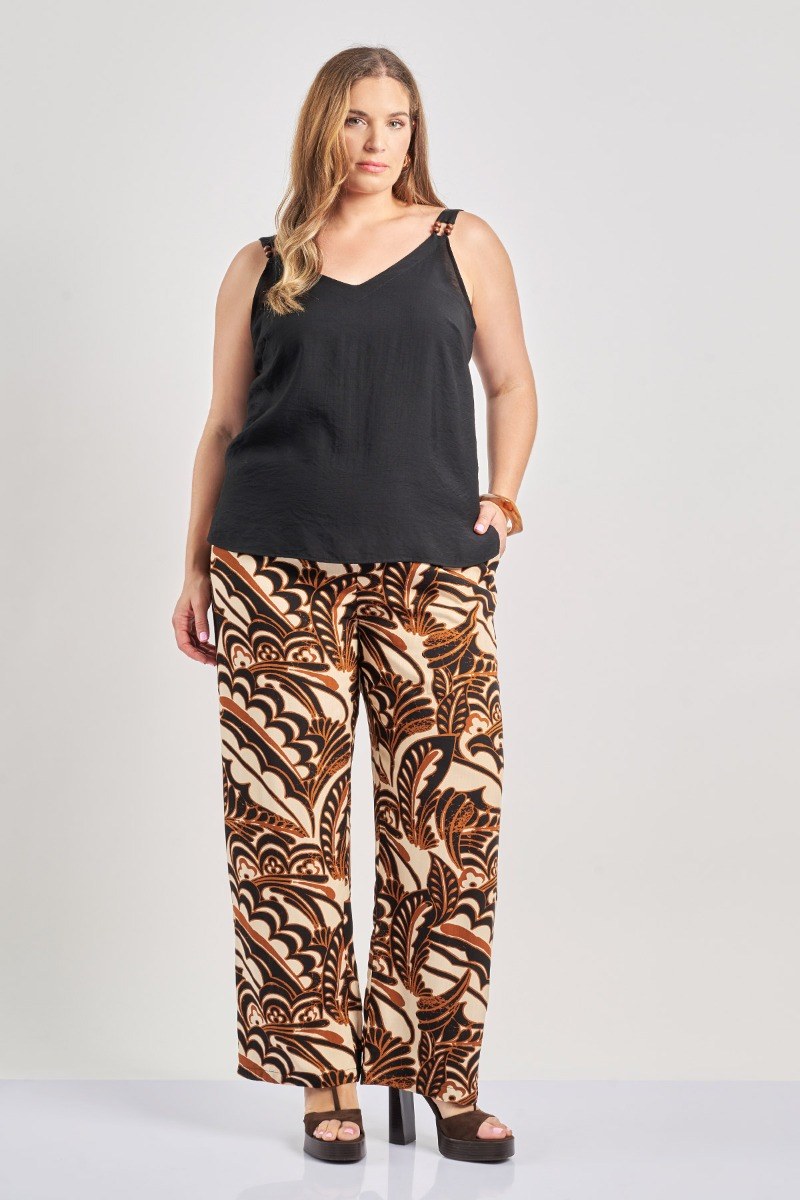 Ελαστική φλοράλ εμπριμέ παντελόνα. Λάστιχο στη μέση για άνεση. Ολοκληρώστε το σετ με το κιμονό 012520708915. Το μοντέλο έχει ύψος 180 εκ, στήθος 107, μέση 95, περιφέρεια 122 και φοράει το μέγεθος S