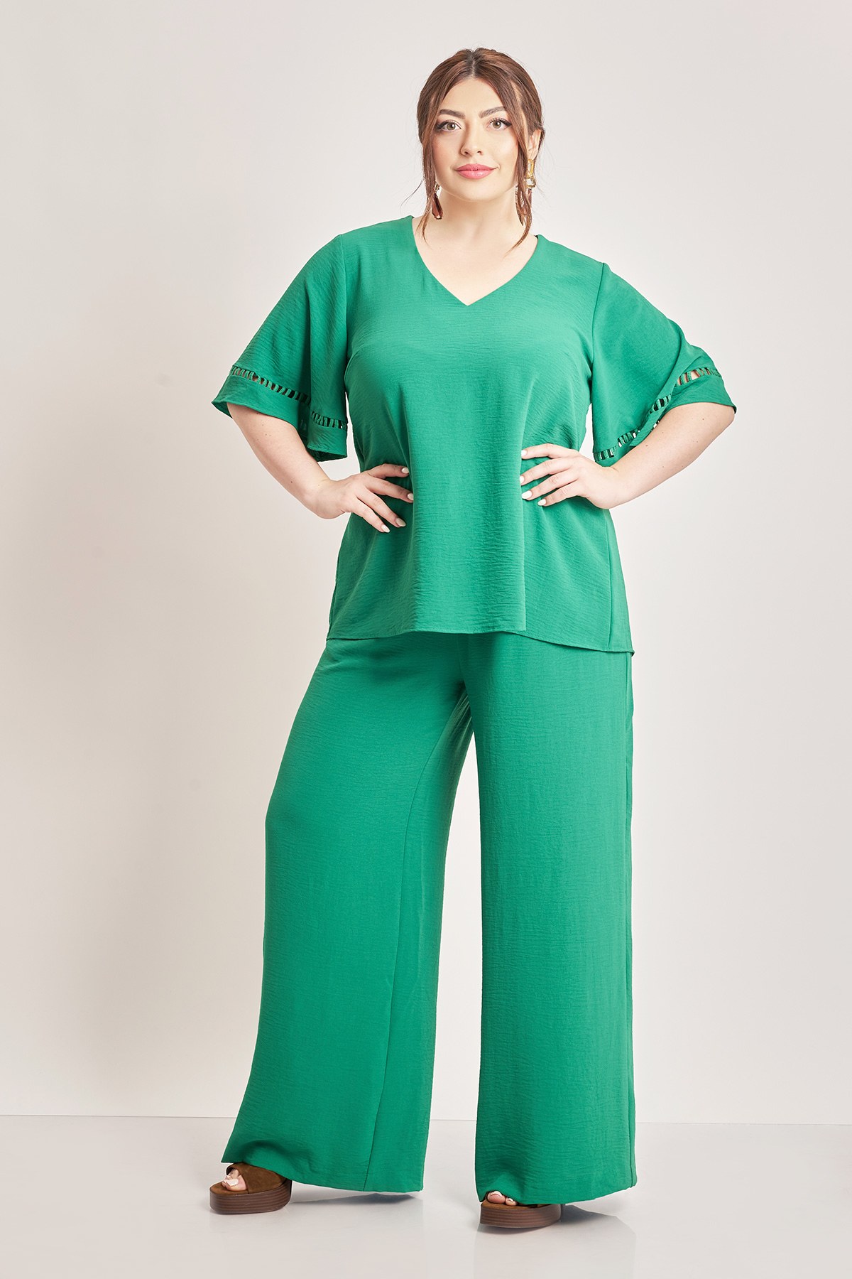 Παντελόνα σε δροσερό ύφασμα washed με ανάγλυφη υφή. Ελαστική μέση με δέσιμο. Σε φαρδιά, ίσια γραμμή. Αέρινη και στυλάτη, ιδανική για όλες τις ώρες. Το μοντέλο έχει ύψος 172εκ, στήθος 112, μέση 92, περιφέρεια 115 και φοράει το μέγεθος S
