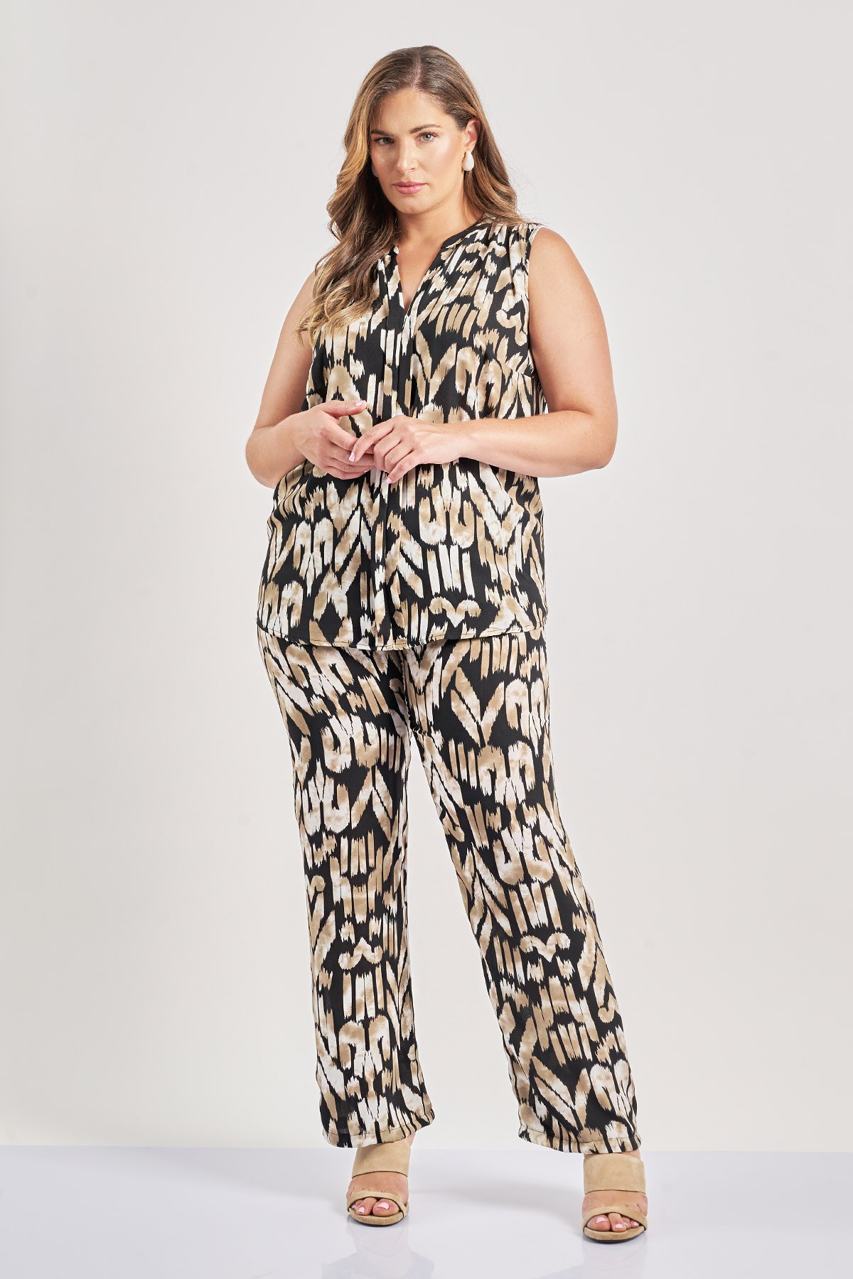 Μακριά παντελόνα σε εμπριμέ abstract ikat-inspired με tribal αισθητική. Ελαστική μέση για άνεση. Ολοκληρώστε το σετ με την μπλούζα 012510109608. Το μοντέλο έχει ύψος 180 εκ, στήθος 107, μέση 95, περιφέρεια 122 και φοράει το μέγεθος S
