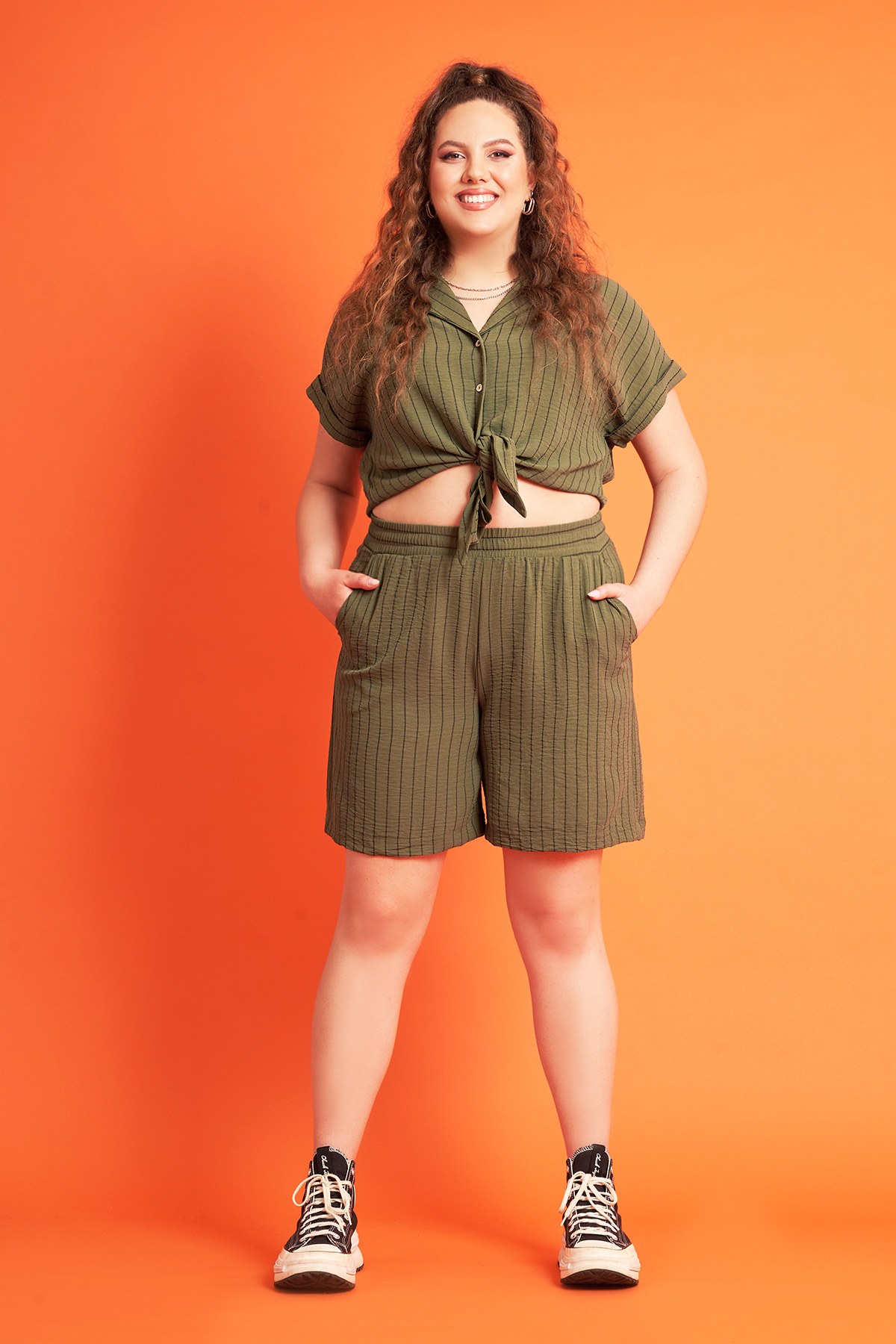 Ριγέ δροσερό σορτς σε όψη λινού. Ελαστική μέση. Πλαϊνές τσέπες. Σε ίσια γραμμή. Συμπληρώστε το σετ με το cropped πουκάμισο με δέσιμο 012410506085.