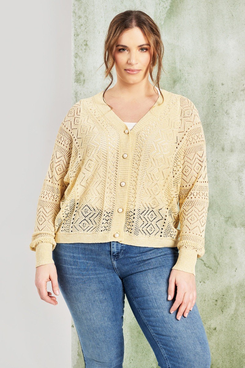 Πλεκτή ζακέτα κοντή με κέντημα. Λαιμόκοψη με V και μακριά μανίκια. Κλείσιμο μπροστά με κουμπιά σε διακόσμη πέρλες. Το μοντέλο έχει ύψος 172 εκ, στήθος 108, μέση 94, περιφέρεια 111 και φοράει το μέγεθος S