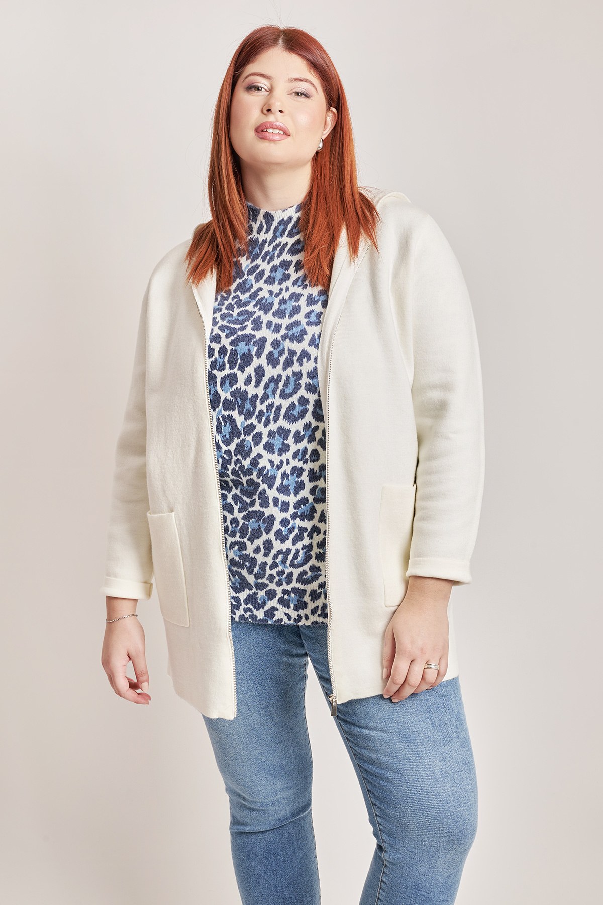 Ζακέτα μάλλινη από απαλή πλέξη σε στιλ διχρωμίας. Διαθέτει κουκούλα ίδιας ύφανσης και μακριά μανίκια. Μπροστινές τσέπες και κλείσιμο με φερμουάρ. Το μοντέλο έχει ύψος 179 εκ, στήθος 109, μέση 89, περιφέρεια 119 και φοράει το μέγεθος S