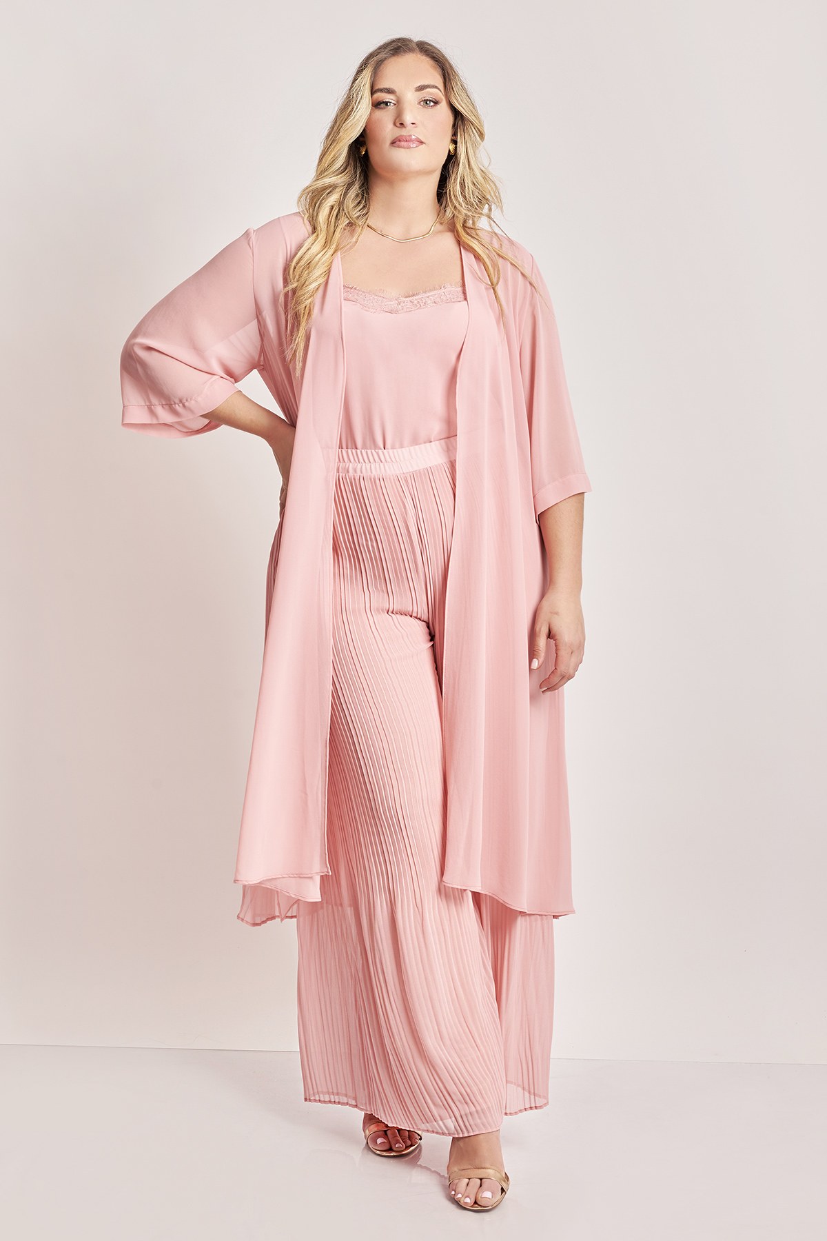 Μακρύ κιμονό ημιδιάφανο. Μανίκια 3/4, χωρίς κλείσιμο μπροστά. Πλισέ λεπτομέρεια στην πίσω όψη. Συνδυάστε το με την παντελόνα 012410205497 και απογειώστε το look σας. Το μοντέλο έχει ύψος 179 εκ, στήθος 109, μέση 89, περιφέρεια 119 και φοράει το μέγεθος S