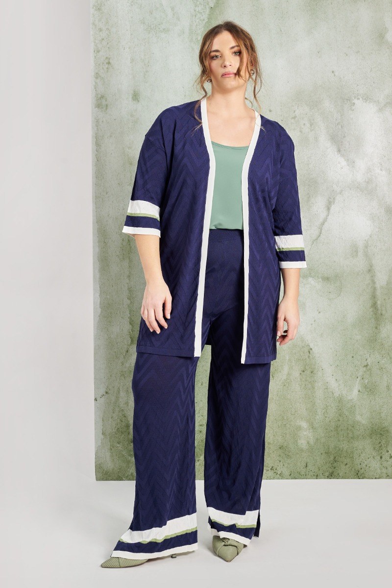 Μακριά πλεκτή ανάγυφη παντελόνα. Ελαστική μέση για άνεση και άψογη εφαρμογή. Λεπτομέρεια colorblock στο τελείωμα. Ολοκληρώστε το σετ με το κιμονό 012510706318. Το μοντέλο έχει ύψος 172 εκ, στήθος 108, μέση 94, περιφέρεια 111 και φοράει το μέγεθος S
