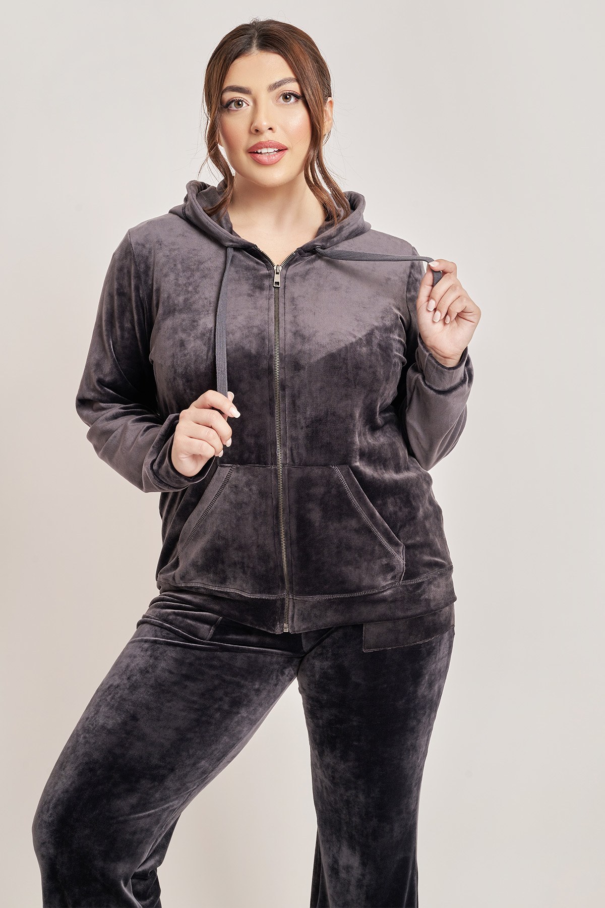 Βελουτέ ζακέτα με φερμουάρ και κουκούλα με ρυθμιζόμενο κορδόνι. Σε ίσια γραμμή με τσέπες τύπου καγκουρό. Μπάσκα στo τελείωμα και μανσέτες στα μανίκια. Ολοκληρώστε το σετ φόρμας με το παντελόνι με κωδικό 012420217077. Το μοντέλο έχει ύψος 172εκ, στήθος 108, μέση 94, περιφέρεια 111 και φοράει το μέγεθος S